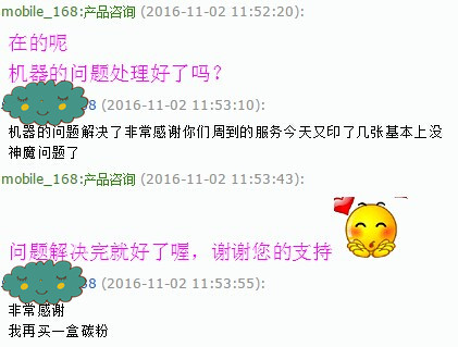 第二天,客戶又找到我們客服,客服問客戶機器有沒有處理好了??蛻粽f機器的問題處理好了,還夸我們的服務非常周到,還跟我們客服說,今天又印了幾張,基本上沒什么問題了呢,表示非常感謝,然后,要在我們這邊買多一盒碳粉。