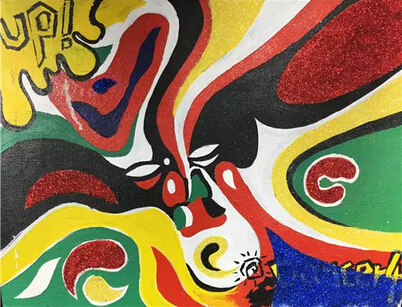 《話臉譜》是由我國(guó)傳統(tǒng)戲劇臉譜為基礎(chǔ),經(jīng)過(guò)線條、色塊的變形,表現(xiàn)出更為夸張的臉部表情。整體色彩鮮明,對(duì)比強(qiáng)烈,亮晶晶的粉末裝飾成為點(diǎn)睛之筆,使傳統(tǒng)的京劇臉譜變得更加鮮活、閃亮。