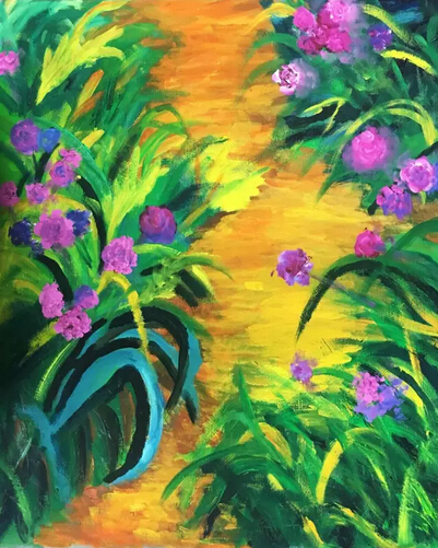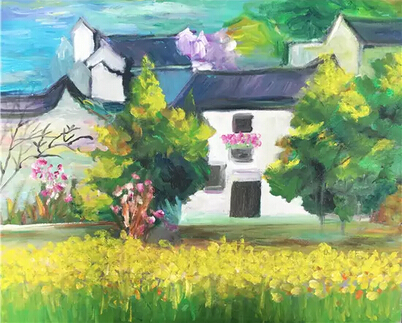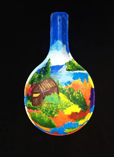 馬勺丙烯畫(huà)。在馬勺上,用丙烯顏料畫(huà)出房子前的大海,以及周邊的花叢。