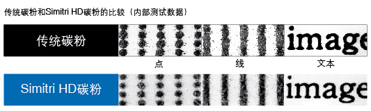 擁有700項專利的Simitri HD高清晰聚合碳粉,直徑僅6.5μm,遠遠小于直徑為8μm的普通研磨碳粉,所以可以產生更細、更一致的線條和更小的半色調點,而且生產出的高清晰度文本不會產生色彩的波動,尤其在普通復印時表現力度更為出色,可獲得生動色彩接近于鹵化銀的原稿照片。